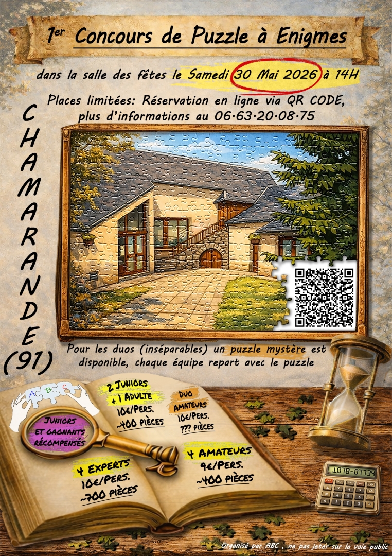 L'association ABC vous propose son premier concours de puzzle à énigmes samedi 30 mai 2026 à 14h00 à la salle des fêtes.