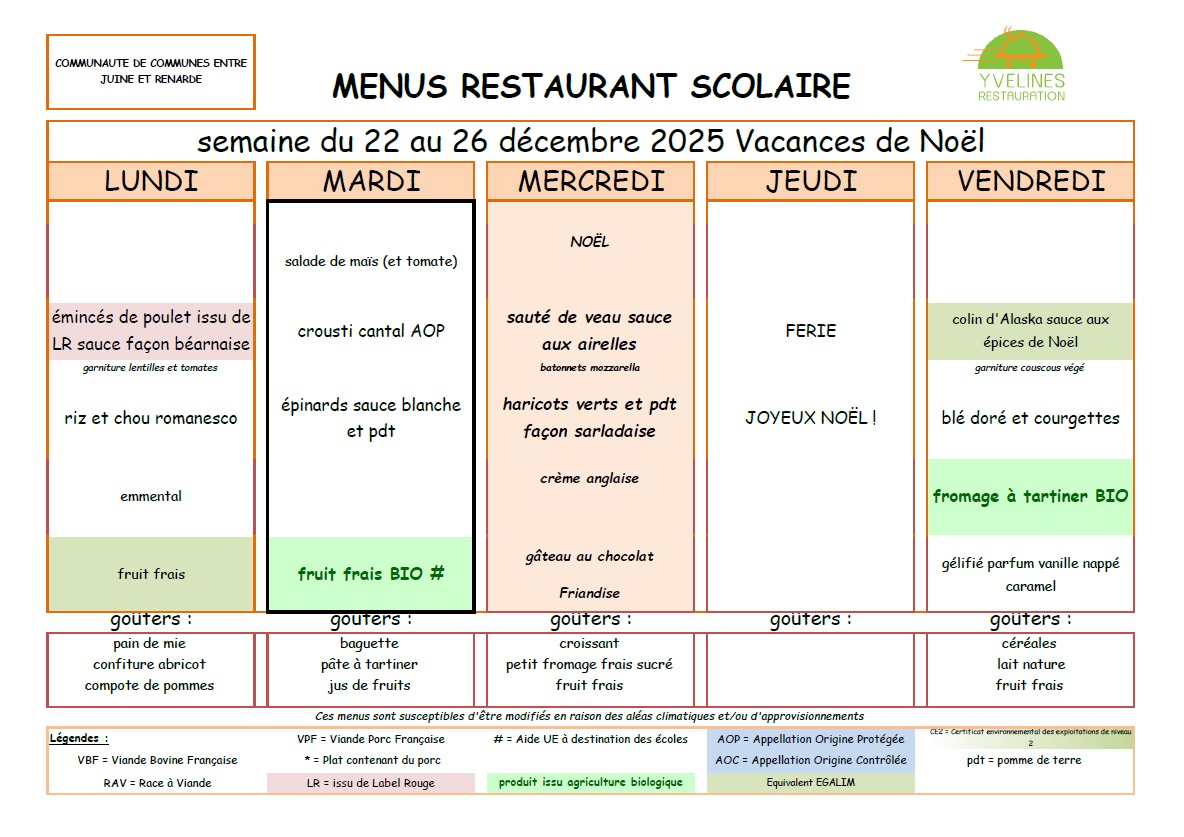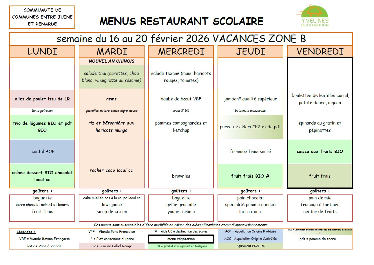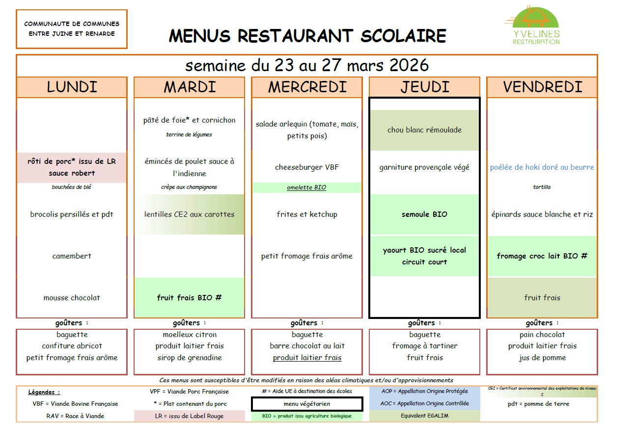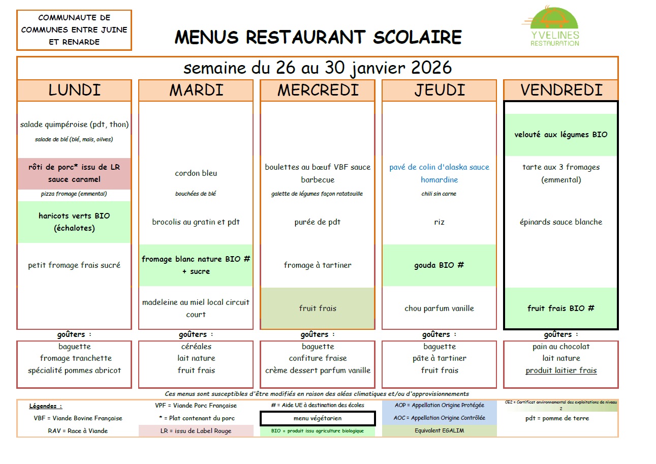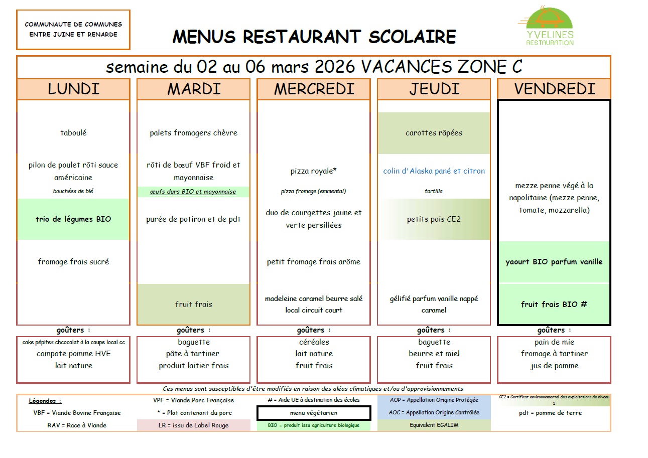 Remarque importante : Le tarif des repas de la cantine est de la responsabilité de la Communauté de Communes "Entre Juine et Renarde".