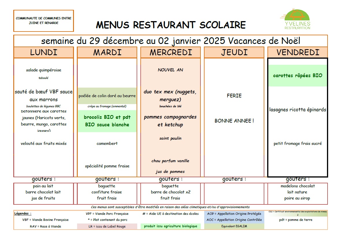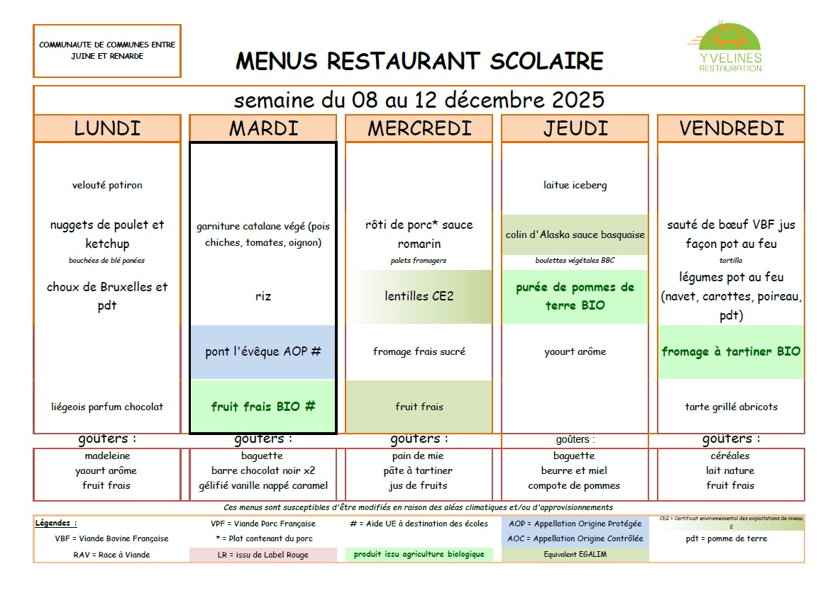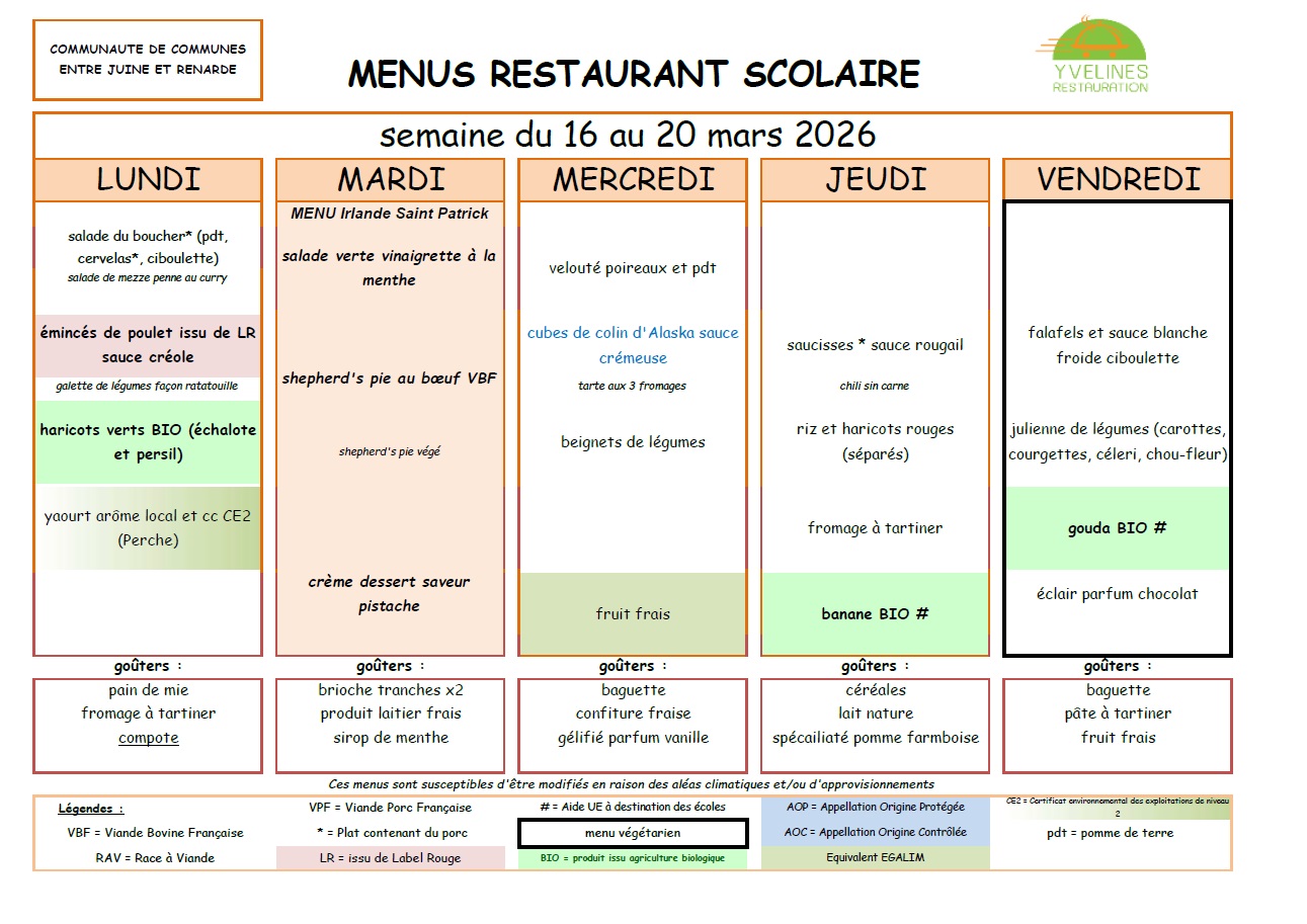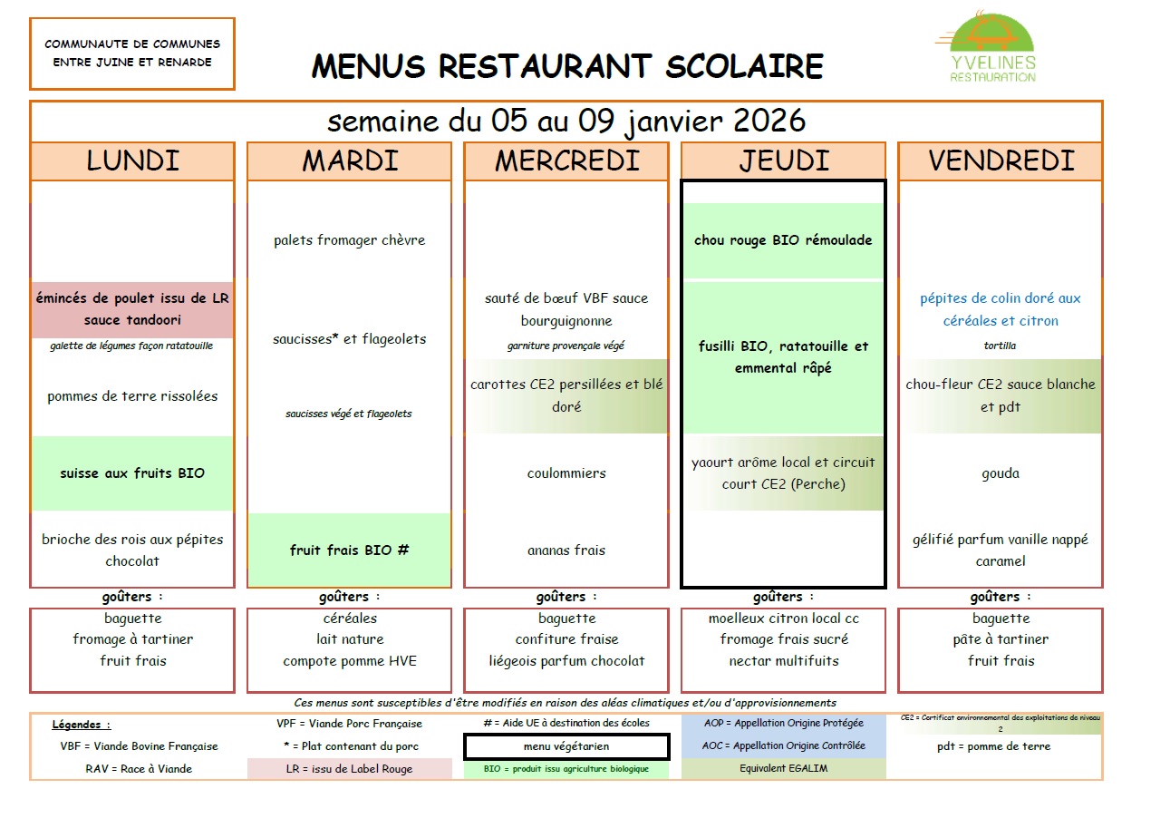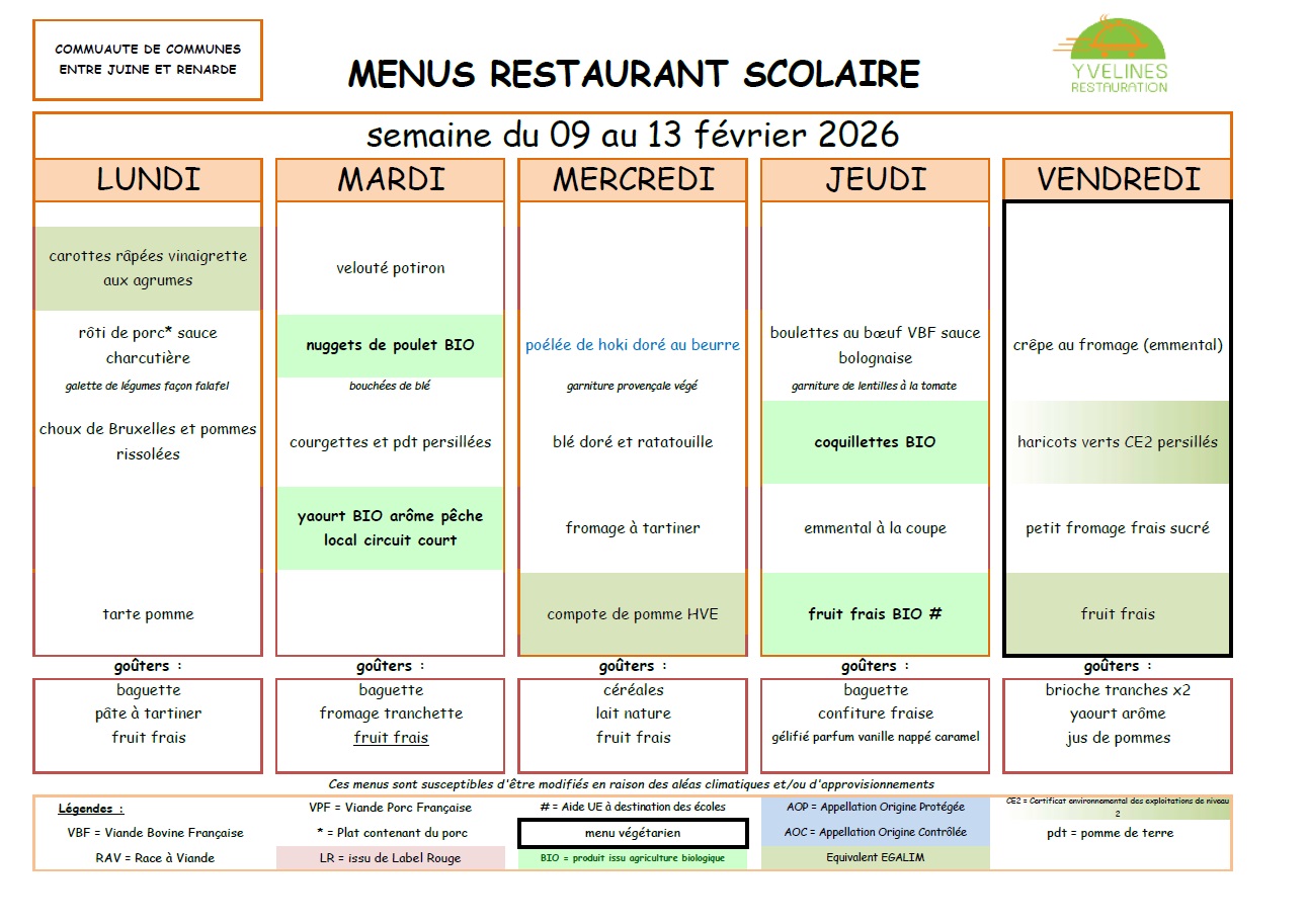 Remarque importante : Le tarif des repas de la cantine est de la responsabilité de la Communauté de Communes "Entre Juine et Renarde".