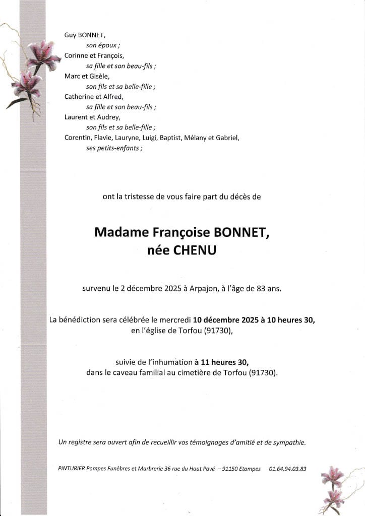 2 Décembre - Décès de Madame Françoise BONNET